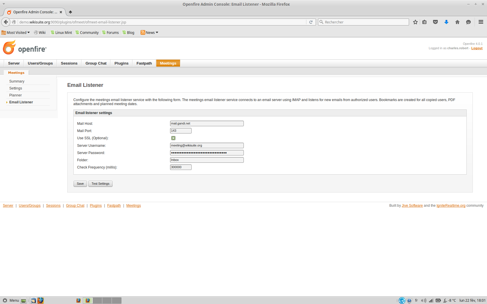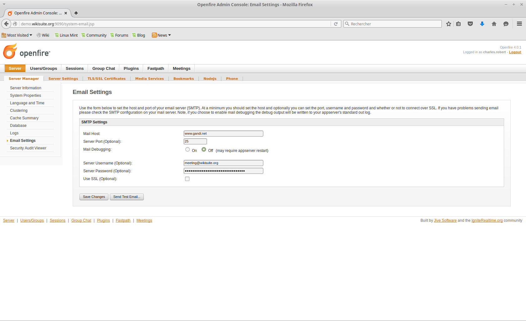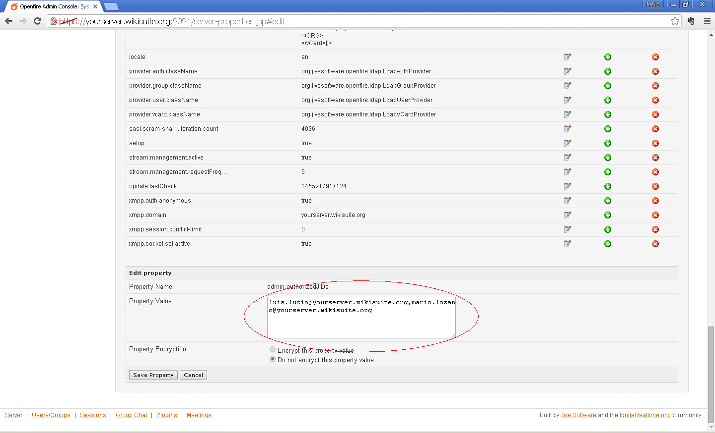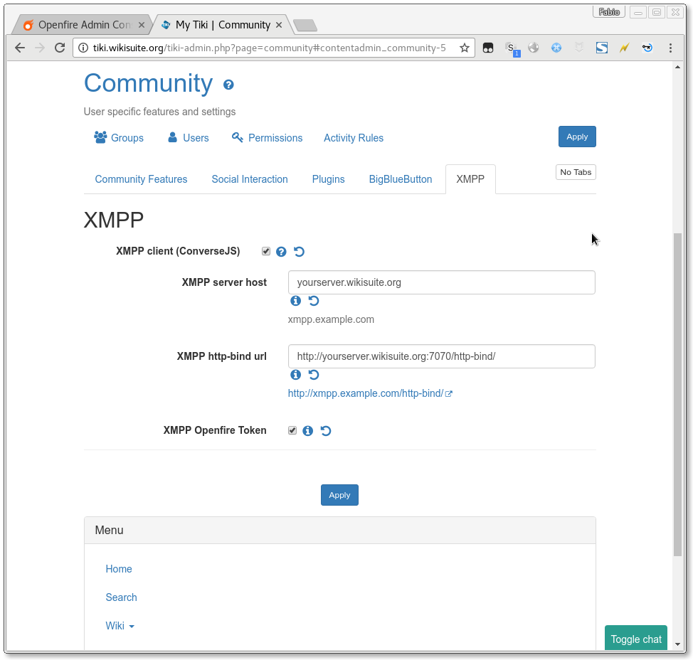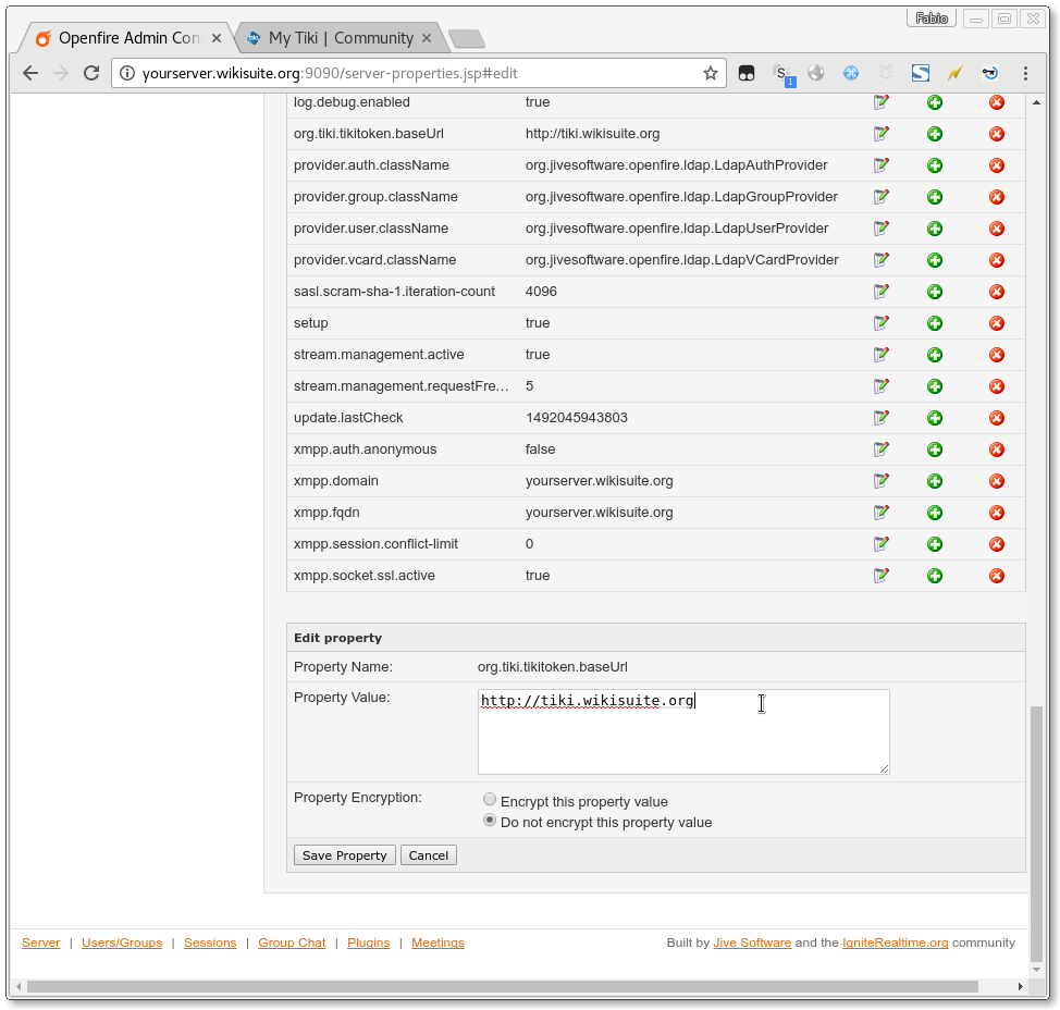 - On XMPP http-bind url field, type https://yourserver.wikisuite.org:7070/http-bind/ .