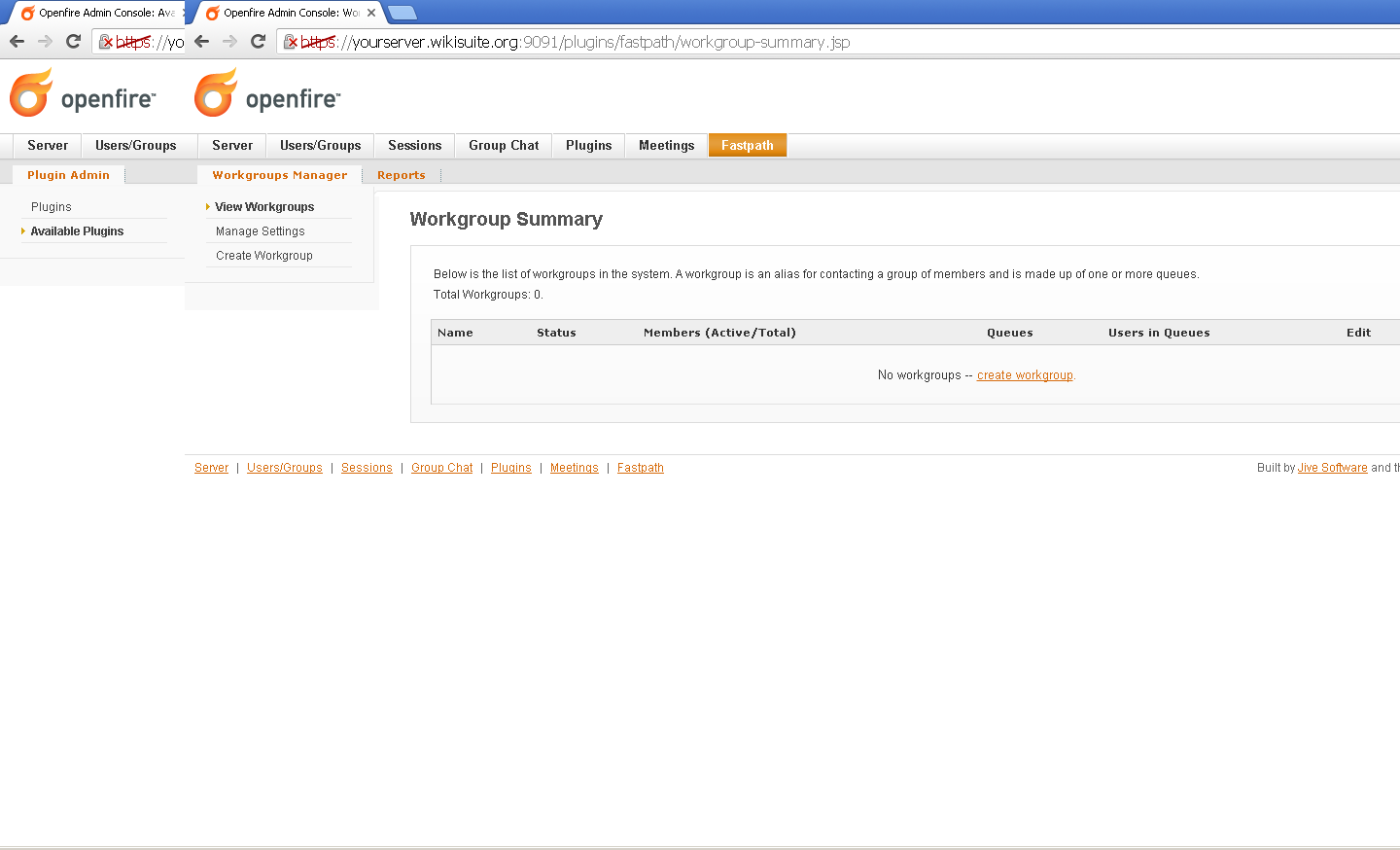 1.- Once the plugin has been successfully installed, the Fastpath tab should be available, click on it to configure Workgroups (https://yourserver.wikisuite.org:9091/plugins/fastpath/workgroup-summary.jsp).