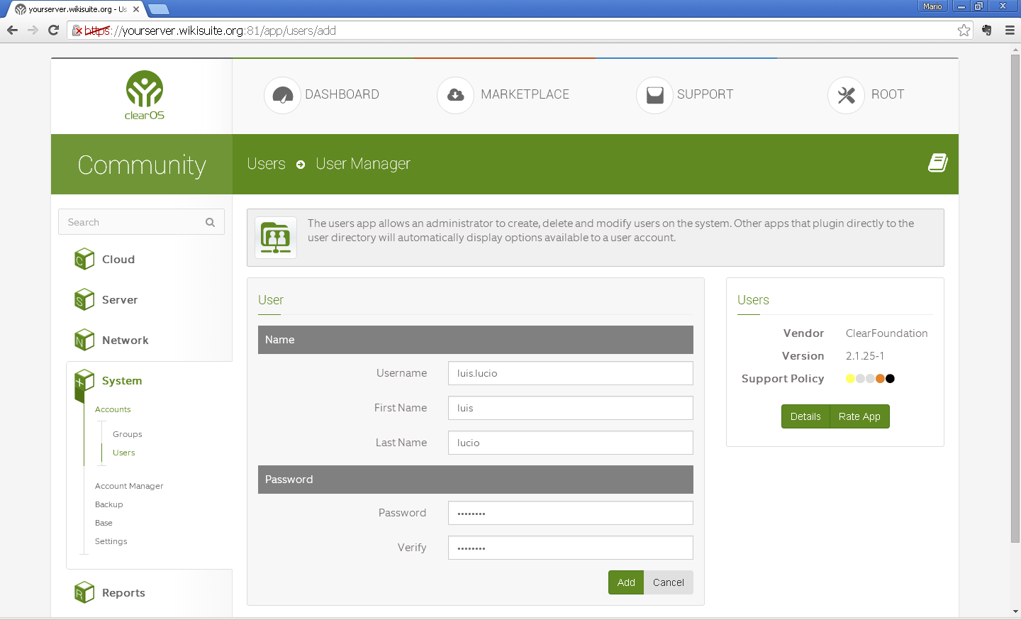 4.-Don't forget to create one or two users as they will be used in the Openfire configuration phase. Use: (https://yourserver.wikisuite.org:81/app/users/add).