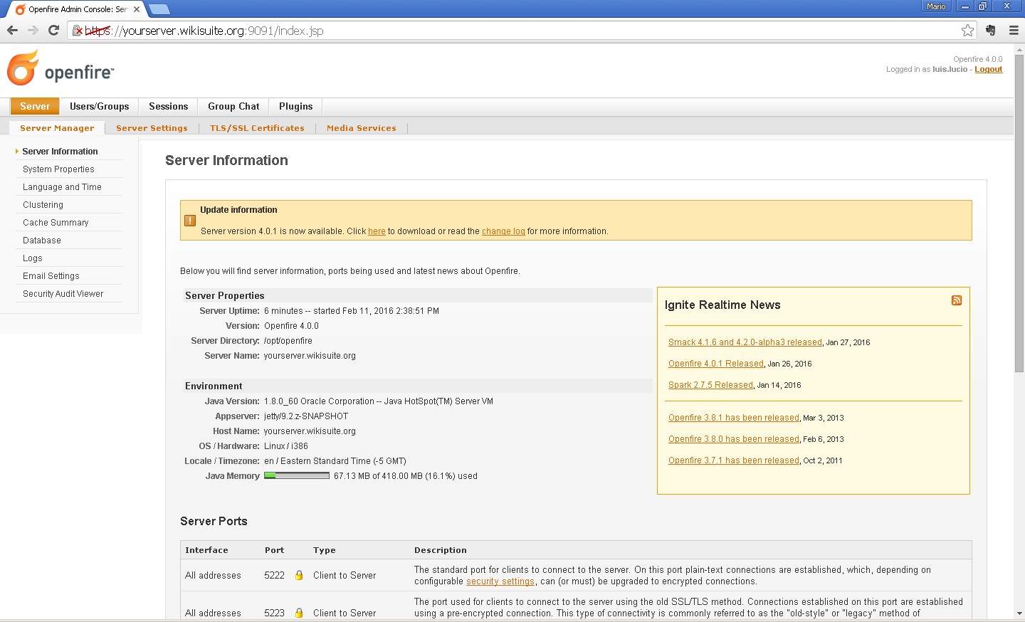 3) Go to "Server / Communication and Collaboration / Openfire" in the menu to: