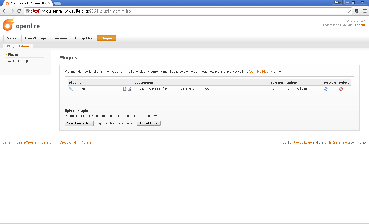 The Openfire app for Clearos will have already installed and done basic setup of the following plugins: